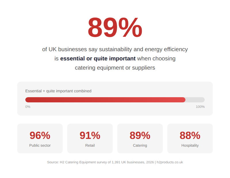 Research conducted across 1,391 UK businesses has established that sustainability and energy efficiency have become central considerations in catering equipment procurement, with 89% of firms surveyed rating these factors as either “essential” or “quite important” when choosing new equipment or suppliers.