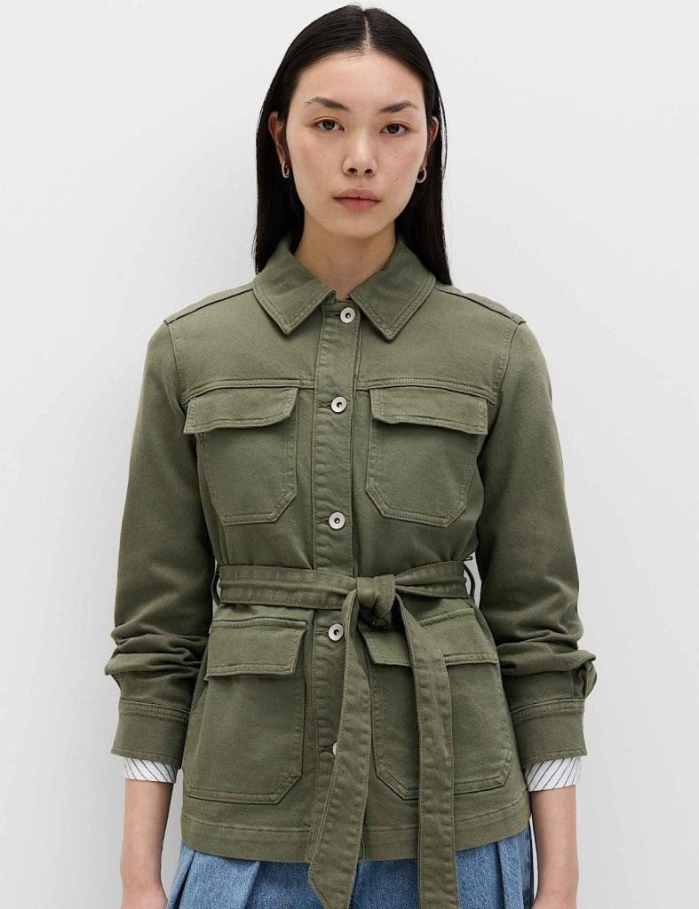 Cut to a regular fit with a detachable belt at the waist, this piece offers the kind of flattering shaping that separates a great shacket from an ordinary one. The collared neckline, button-through front, and flap pockets give it a military-meets-workwear edge that feels completely current for 2026. Whether you wear it open over a fitted vest or belted and buttoned as a standalone top, it adapts to your styling instincts.